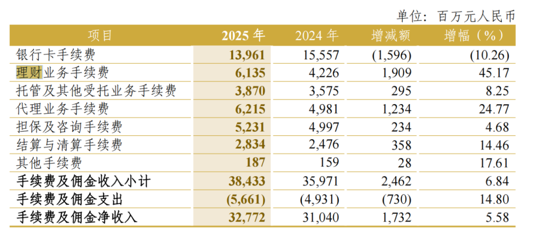 盈利数据则更清晰地证明了这种“缓冲”效果。2025年,中信银行实现归母净利润706.18亿元,同比增长2.98%,增幅位居同业前列。但营业收入2124.75亿元,同比微降0.55%。这一“增利不增收”的微妙反差,正体现了“以量补价”和成本控制的综合成效。更具深远意义的是收入结构的蜕变:非利息净收入达680.06亿元,占比提升至32.01%。其中,理财业务手续费收入同比激增45.17%至61.35亿元,成为一大亮点。这表明中信银行轻资本转型的路径愈发清晰,对传统息差的依赖正在降低。